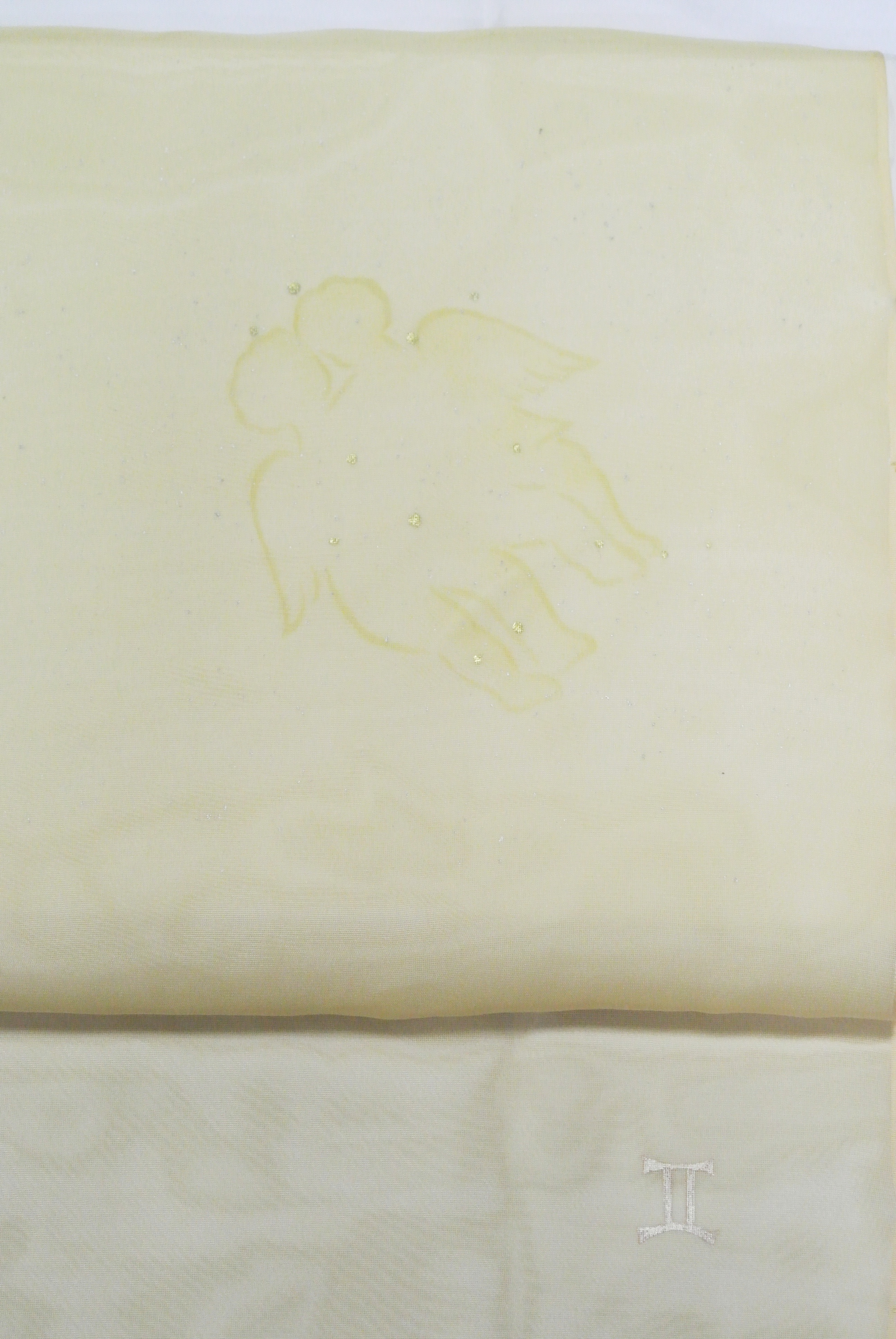 お太鼓は星座のモチーフが描かれた白生地に星座の星が描かれた紗の生地を重ねています。
